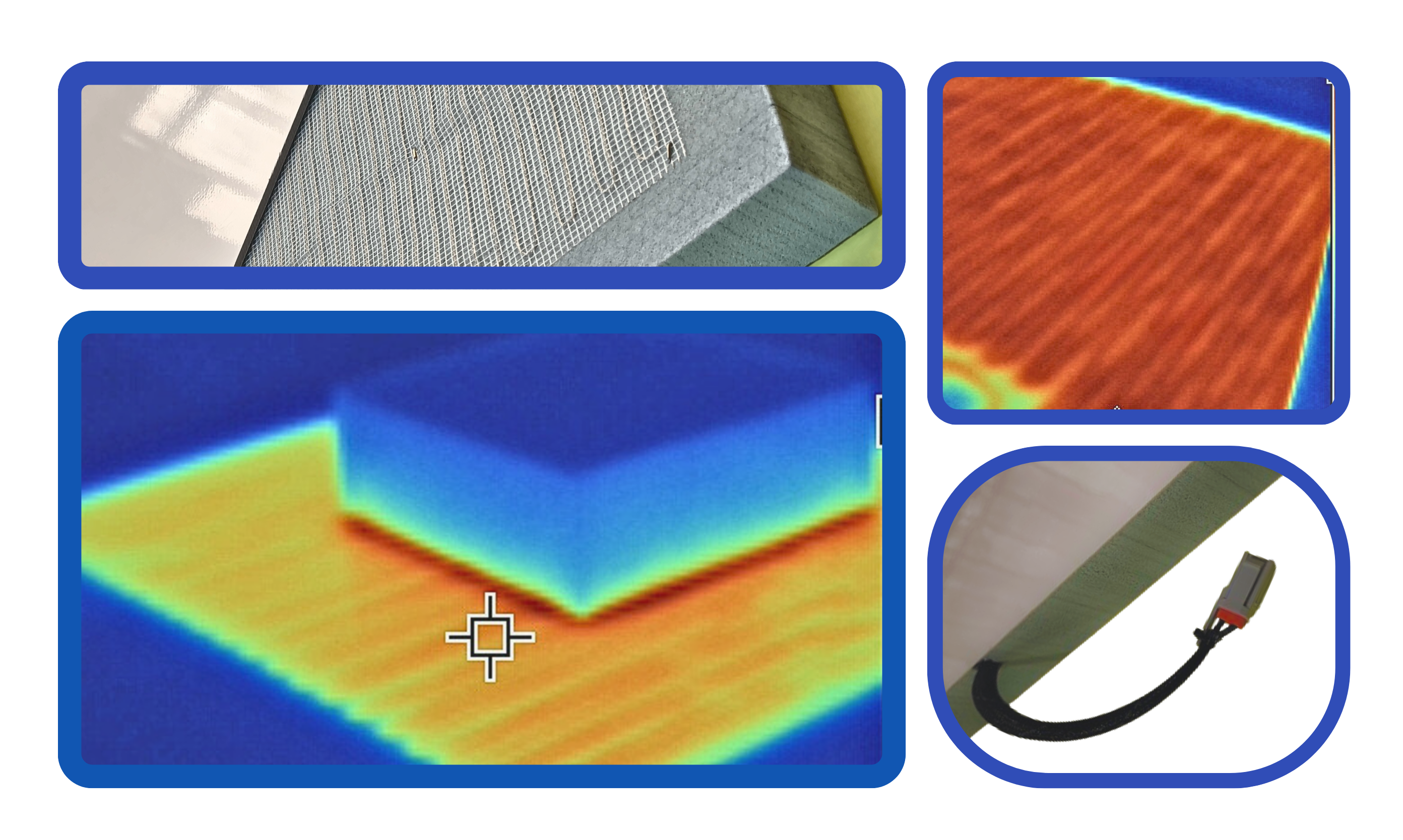 Ame en mousse PET haute densité 100% recyclée (polyéthylène téréphtalate) revêtue de résine polyester armée de fibres de verre dans lequel est inséré un tissu chauffant sous la peau supérieure d’une puissance de 350 w/m2 (Autres puissances possibles, nous consulter).